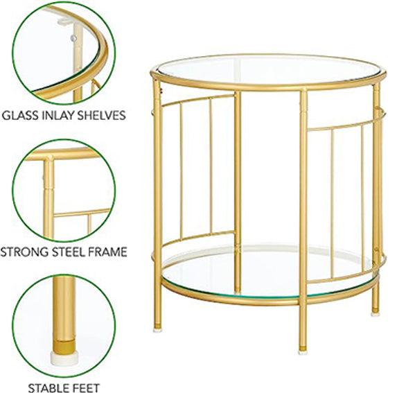 Add a touch of elegance to your living space with the 2-Tier Round Glass Table with Wire Accents in Soft Brass. Featuring a sleek, minimalist design with wire accents, this versatile table offers two tiers of tempered glass for stylish and functional storage or display. Its compact size and luxurious soft brass finish make it an excellent addition to small spaces or as an accent piece in any room.