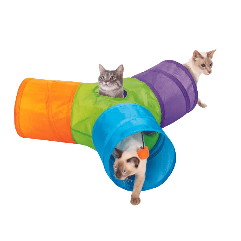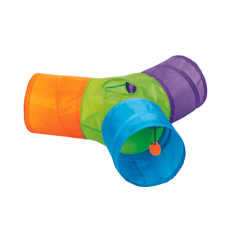 • Engage your cat’s natural instincts with the Intelligent Living 3 Way Cat Tunnel. This multi-color tunnel provides an interactive and stimulating environment for your furry companion. With three spacious tunnels connected by a central peephole, it offers opportunities for exploration, hiding, and play. The collapsible design allows for easy storage when not in use, making it a versatile addition to your cat’s playtime routine.