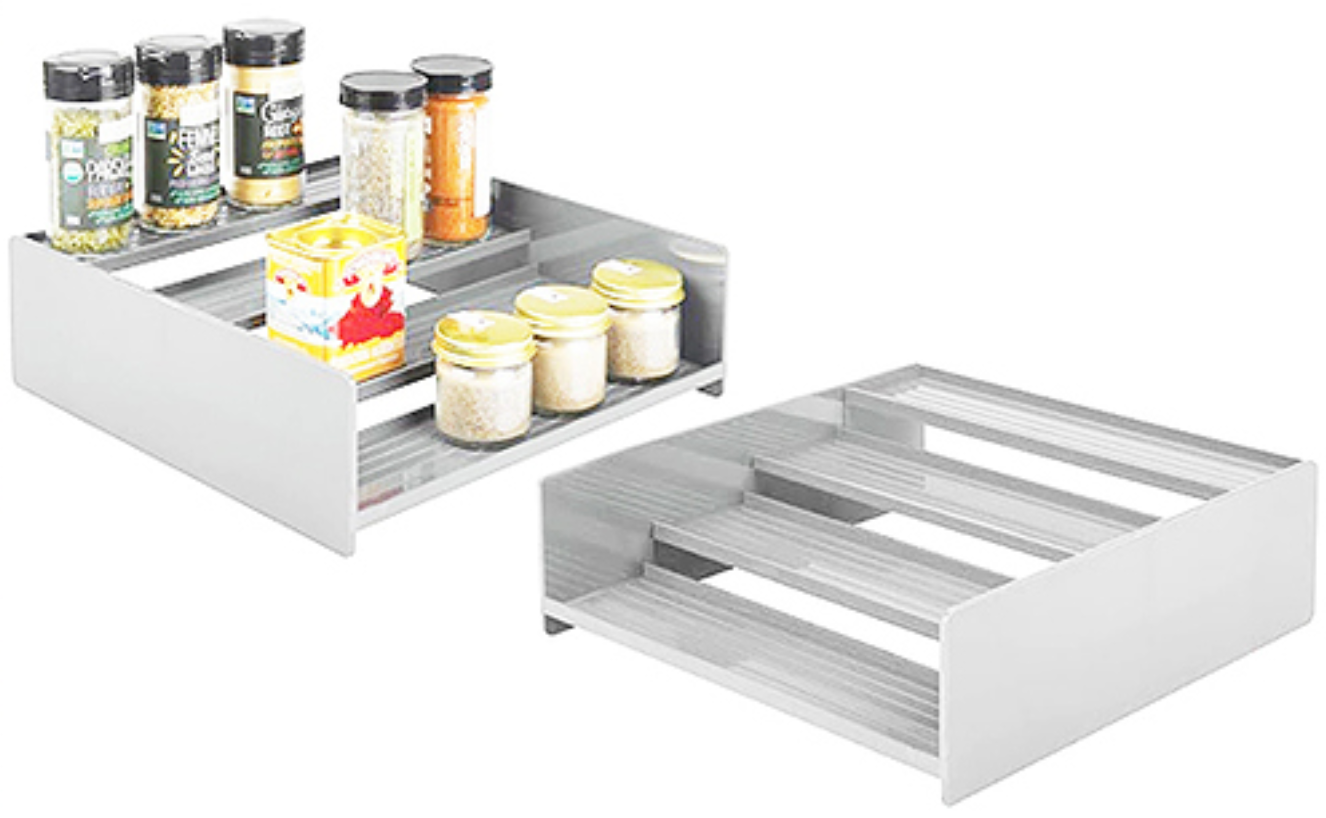 • Keep your kitchen neat and functional with the 4-Tier Organizer Spice Rack (4-Pack) by M-Design. Designed to maximize storage and accessibility, this sleek organizer makes it easy to keep spices, jars, and small pantry items neatly arranged and within reach.