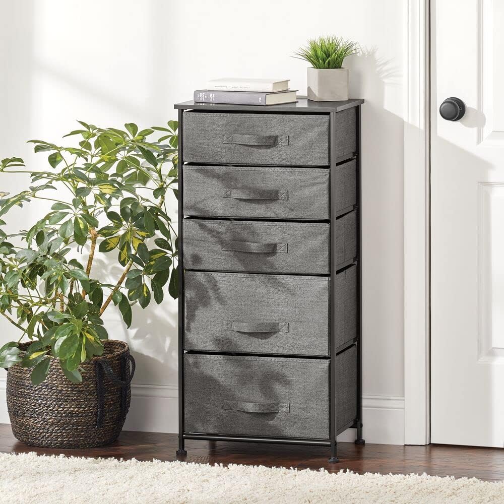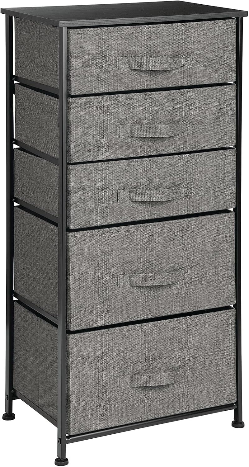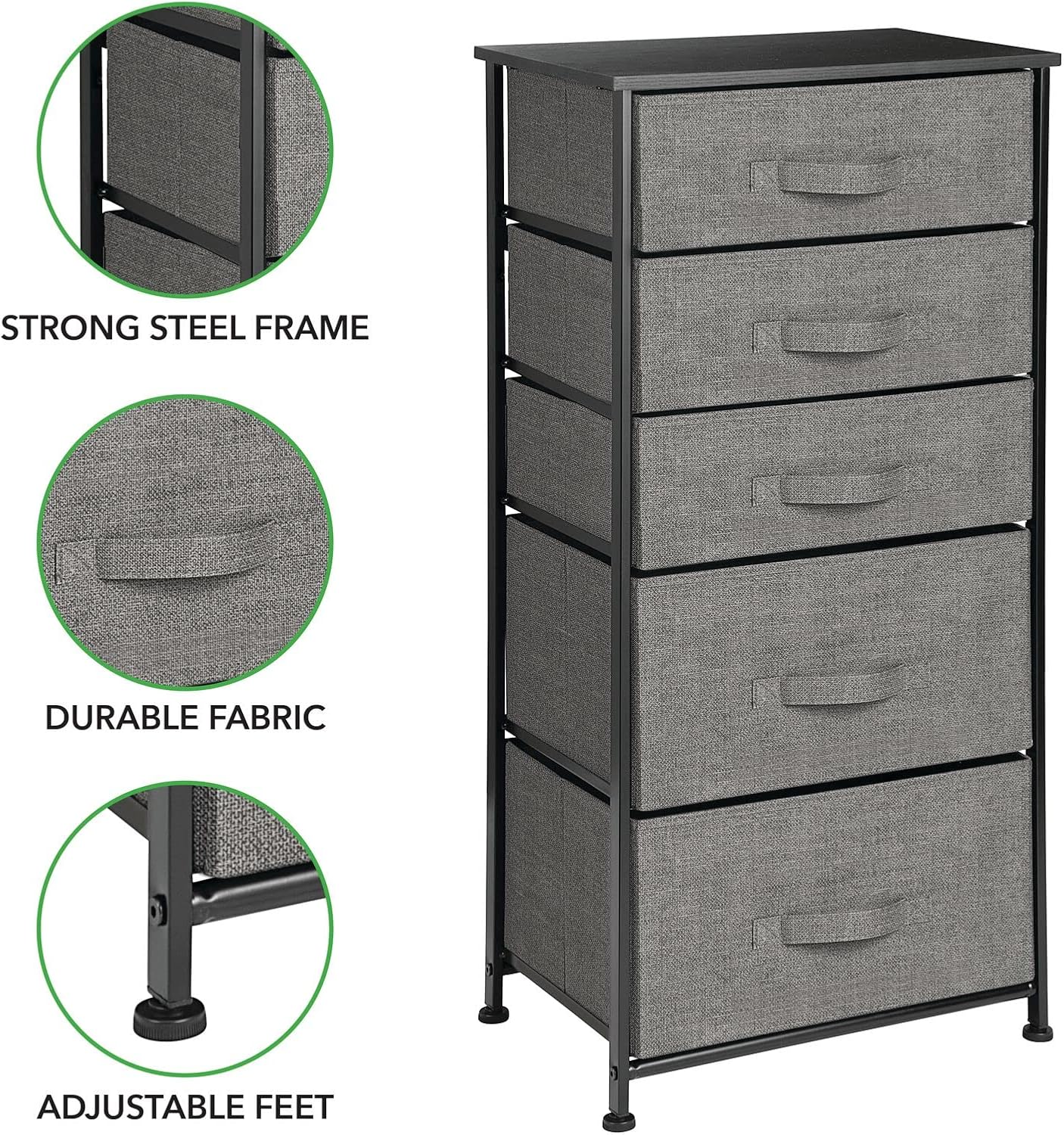Designed with a modern charcoal finish, this unit features five spacious drawers that provide ample storage for clothing, accessories, office supplies, or craft materials.