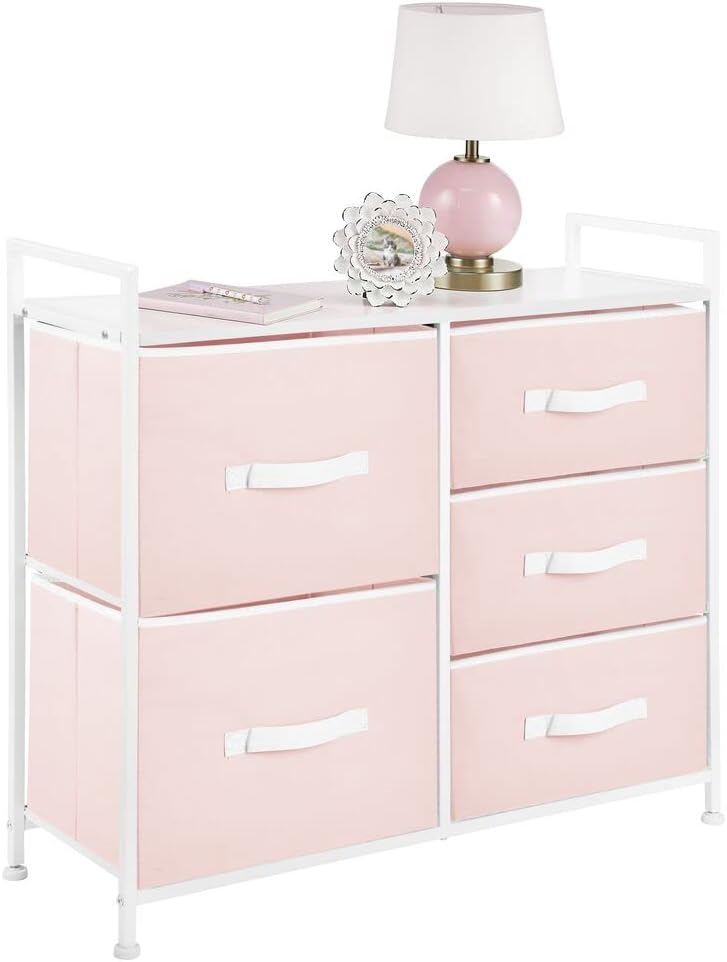 Add functionality and a pop of color to your space with the 5-Drawer Tall Storage Unit in Pink/White. This compact yet spacious storage unit features five lightweight fabric drawers with a soft pink hue, set in a sturdy white metal frame.