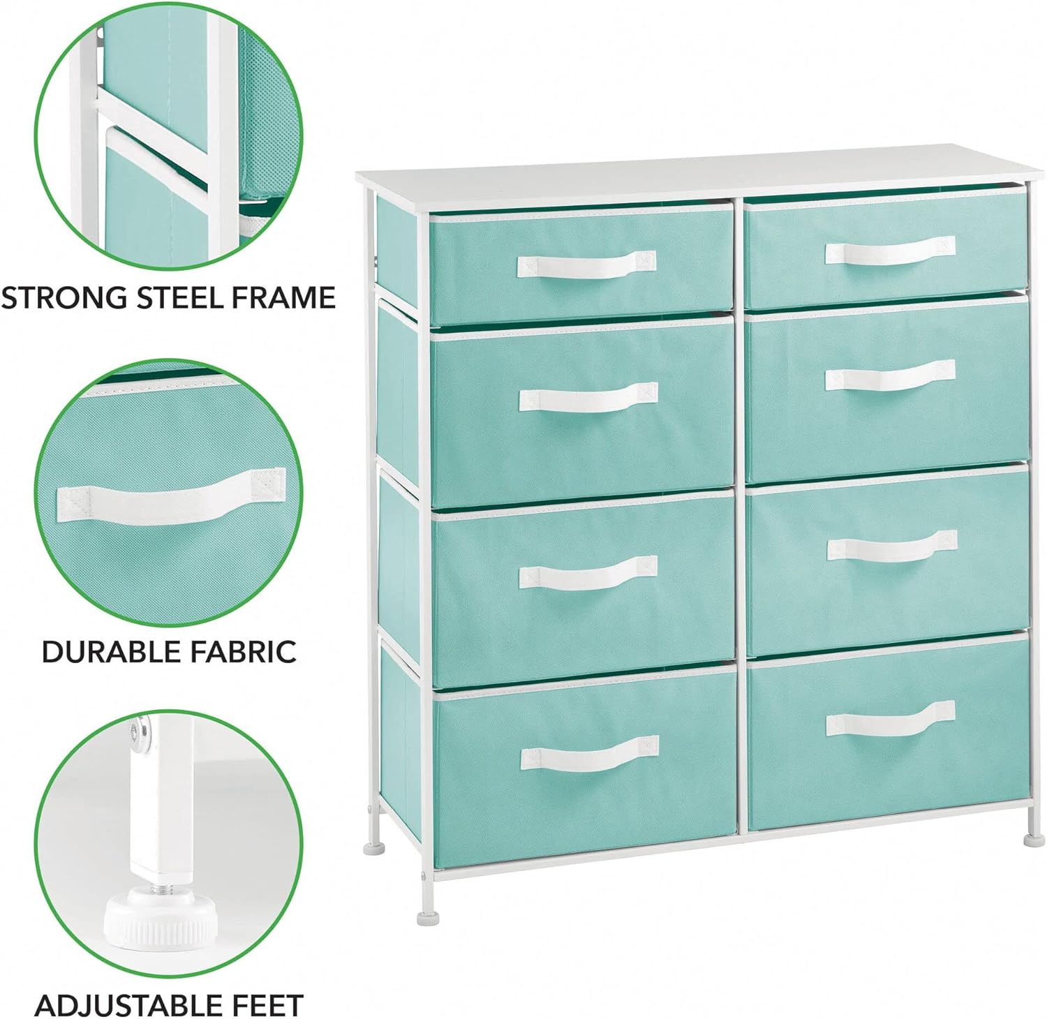 The eight spacious drawers are ideal for organizing clothing, linens, accessories, office supplies, or toys, while the durable frame ensures stability and long-term use.