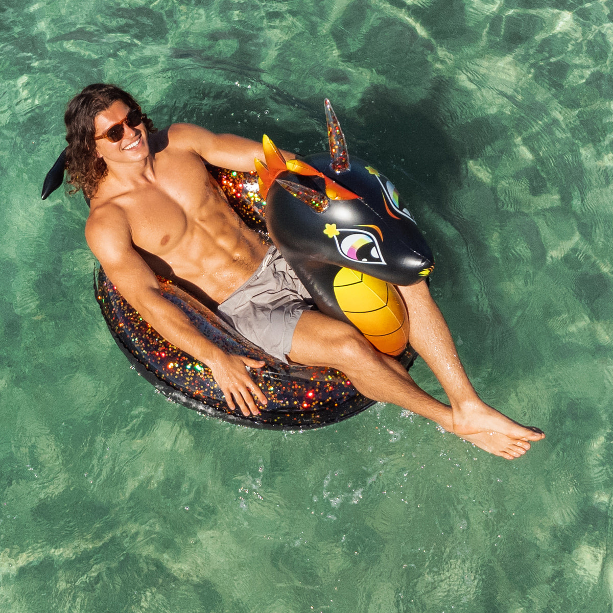 • Prepare for a sparkling new adventure with the Glitter Dragon Pool Tube from PoolCandy! This Jumbo Glitterfied® pool float is filled with holographic glitter that changes color in the sunlight. The Glitter Dragon will make a legendary addition to any swimming pool!