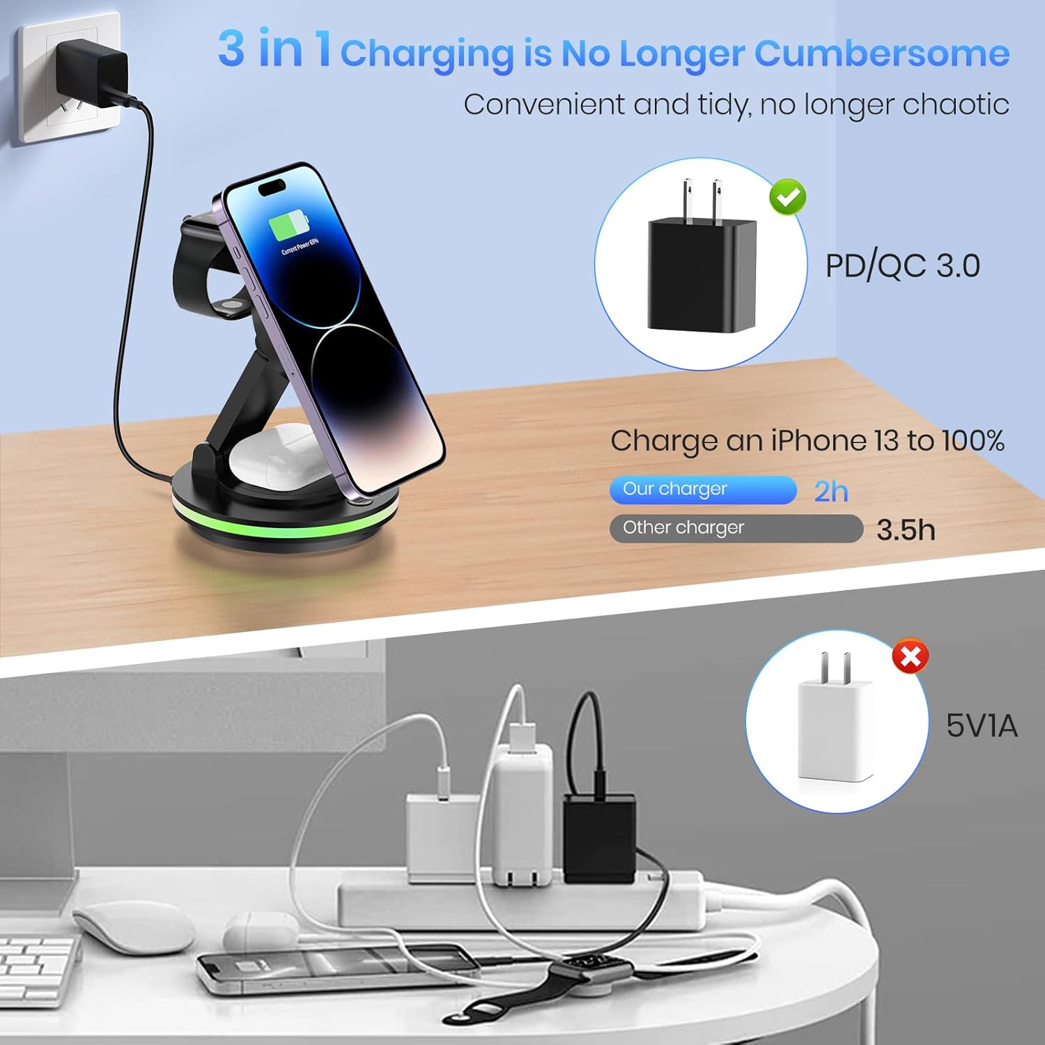 • 3-in-1 Wireless Charging: Simultaneously charges iPhone, Apple Watch, and AirPods for a tidy and efficient setup.