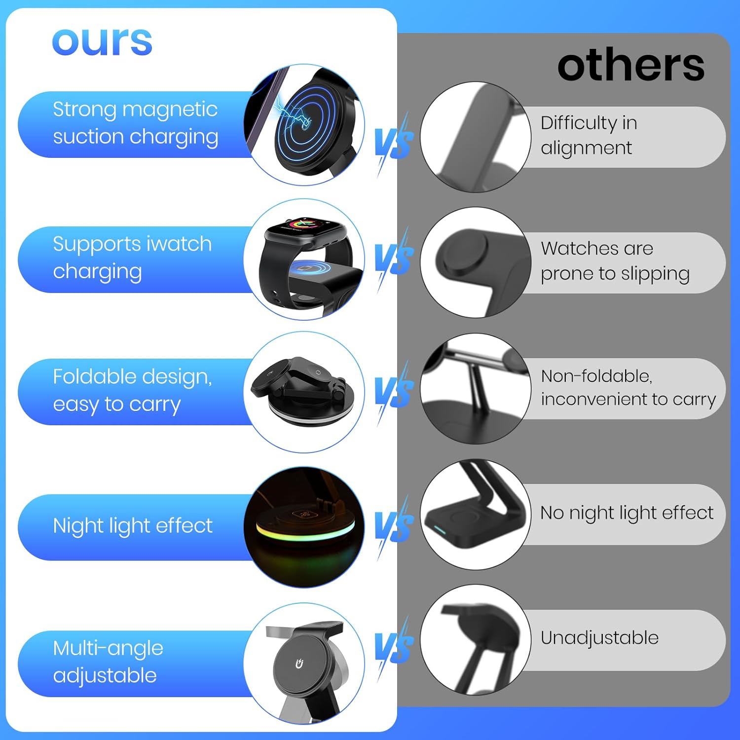 • Magnetic Stand: Non-slip base doubles as a phone holder, allowing vertical or horizontal viewing while charging.